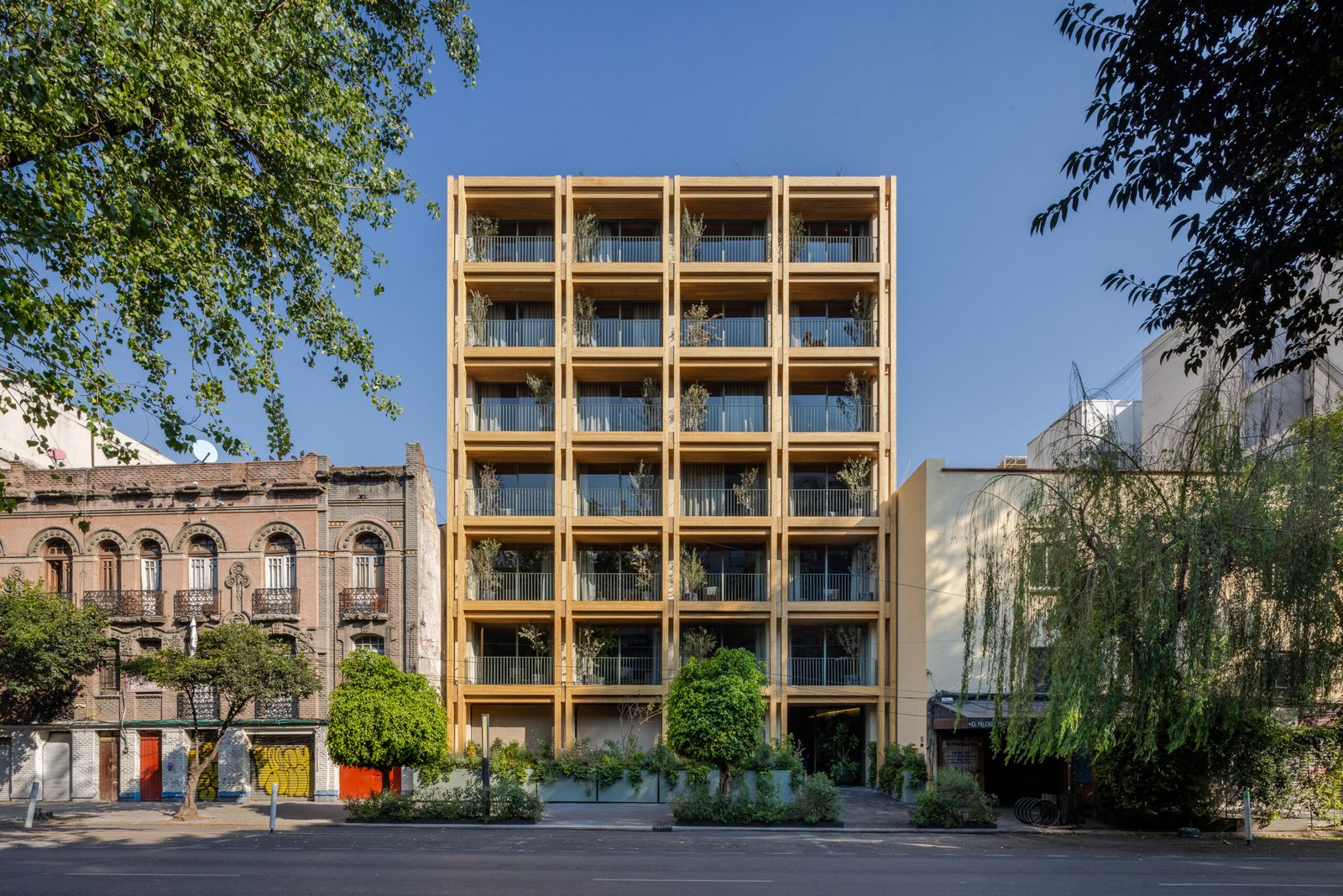 Hotel ubicado en una zona caracterizada por su alta afluencia turística y una intensa vida social. El programa se desarrolla en siete niveles y un sótano. En la planta baja se ubican el vestíbulo y dos locales comerciales, mientras que las habitaciones se distribuyen en dos torres articuladas mediante patios y vegetación, culminando en un roof garden común. La estructura es de madera ensamblada con acero y se complementa con una fachada reticular doble que funciona como filtro climático.